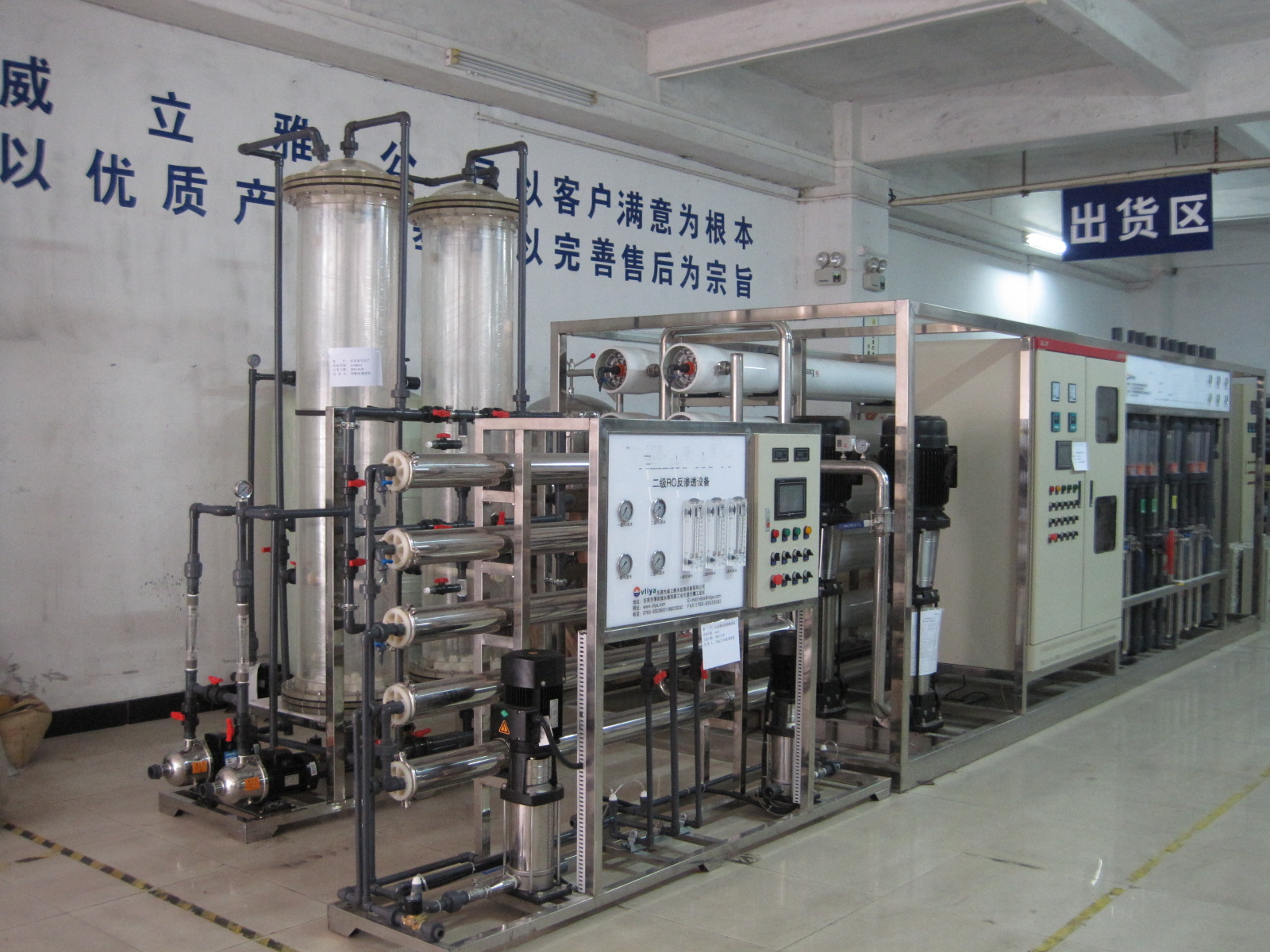设备流程:原水→多介质过滤器→活性炭过滤器→精密过滤器→中间水箱→一级反渗透设备→ →纯水储水箱 →纯水增压泵→